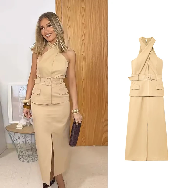فستان طويل اصفر كاجوال للنساء مع حزام بدون أكمام