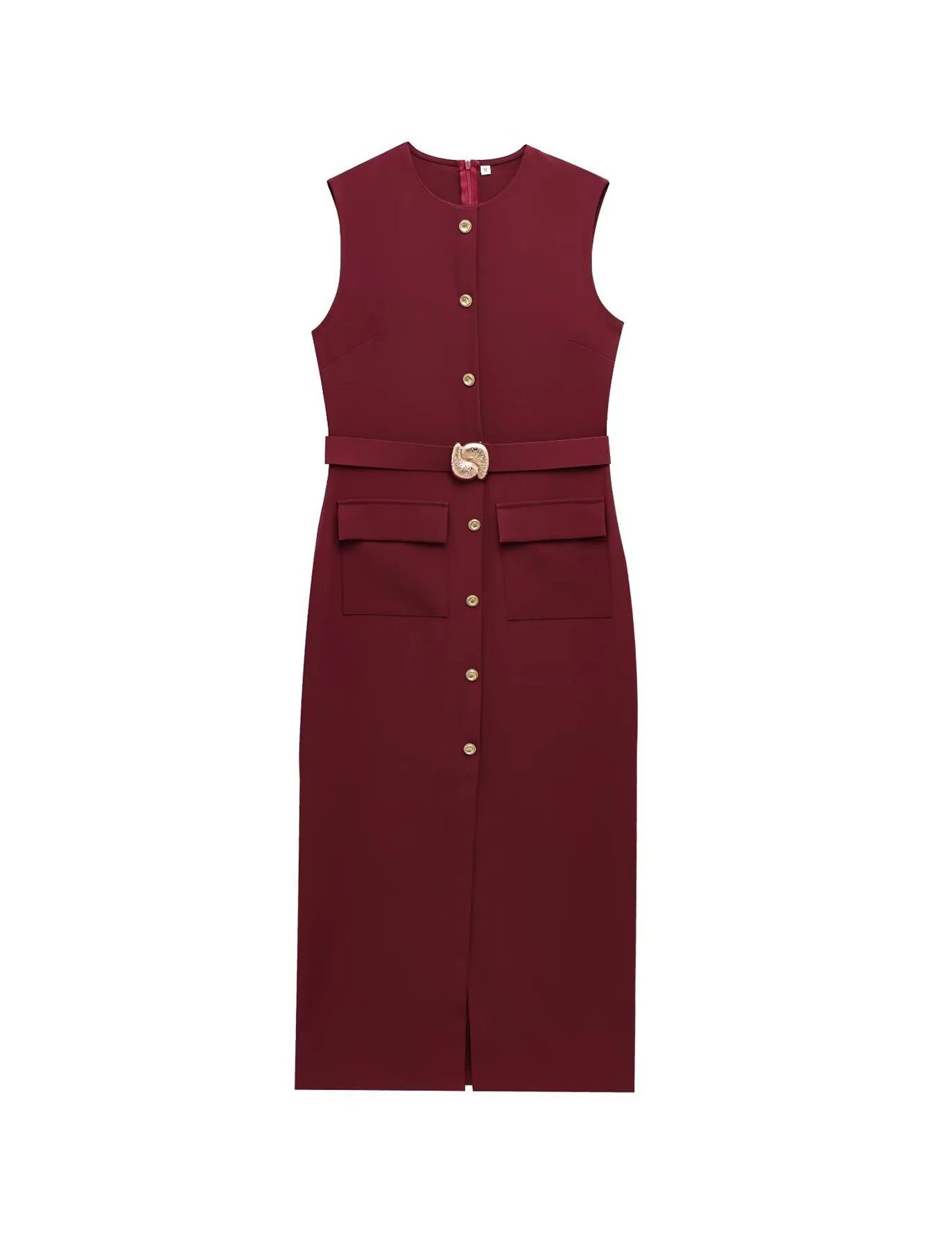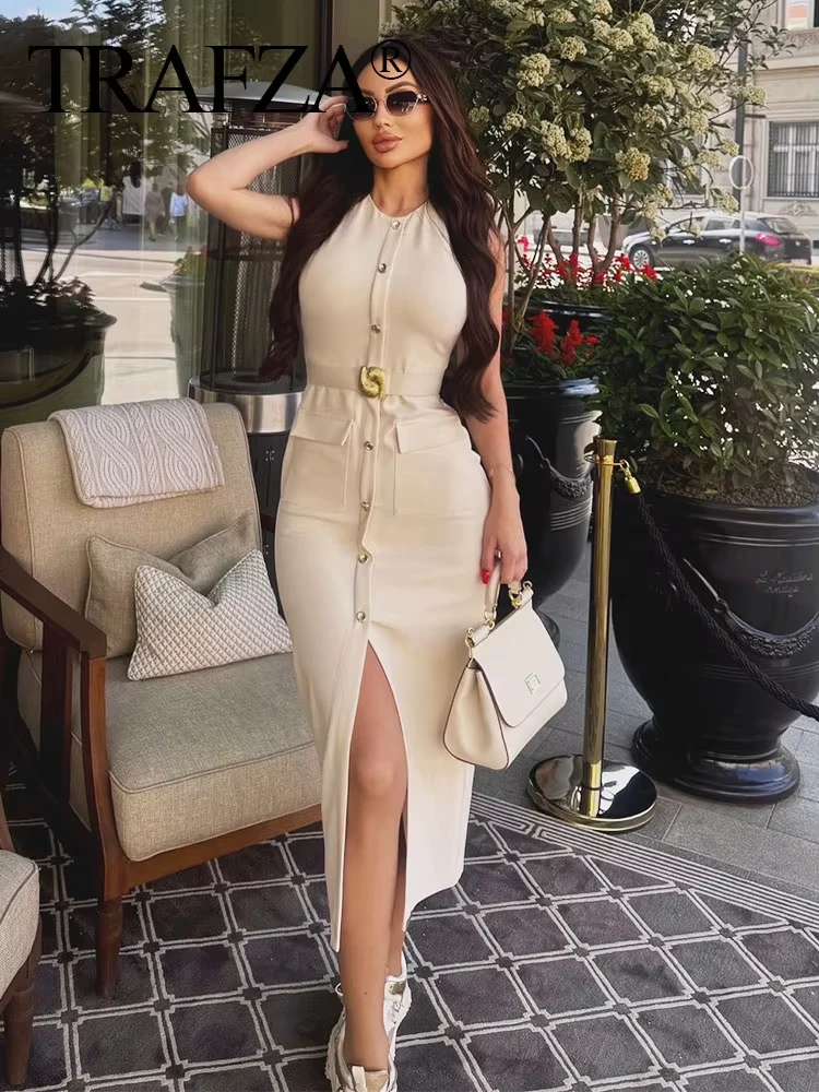 فستان طويل أنيق من TRAFZA يجمع بين البساطة والفخامة، مصنوع بتصميم بلا أكمام مع ياقة دائرية تمنح مظهراً كلاسيكياً جذاباً. يتميز بحزام أنيق يحدد الخصر ويبرز القوام، إضافة إلى سحاب خلفي لارتداء مريح. تصميمه بصدر واحد يمنحه لمسة عصرية، ما يجعله خياراً مثالياً للمناسبات الصيفية، الحفلات، والعطلات الراقية.