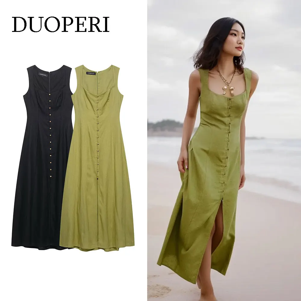 فستان صيفي طويل من علامة DUOPERI مصنوع من قماش الكتان الطبيعي المتين والمريح، بتصميم أنيق وبسيط يبرز جمال القوام. يتميز بياقة مربعة تمنح مظهراً كلاسيكياً عصرياً، وبدون أكمام لراحة أكبر في الأجواء الحارة. السحاب الخلفي يسهّل الارتداء ويحافظ على تناسق القَصّة. خامته الخفيفة تجعله خياراً مثالياً للنزهات، السفر، أو المناسبات الصيفية الأنيقة.