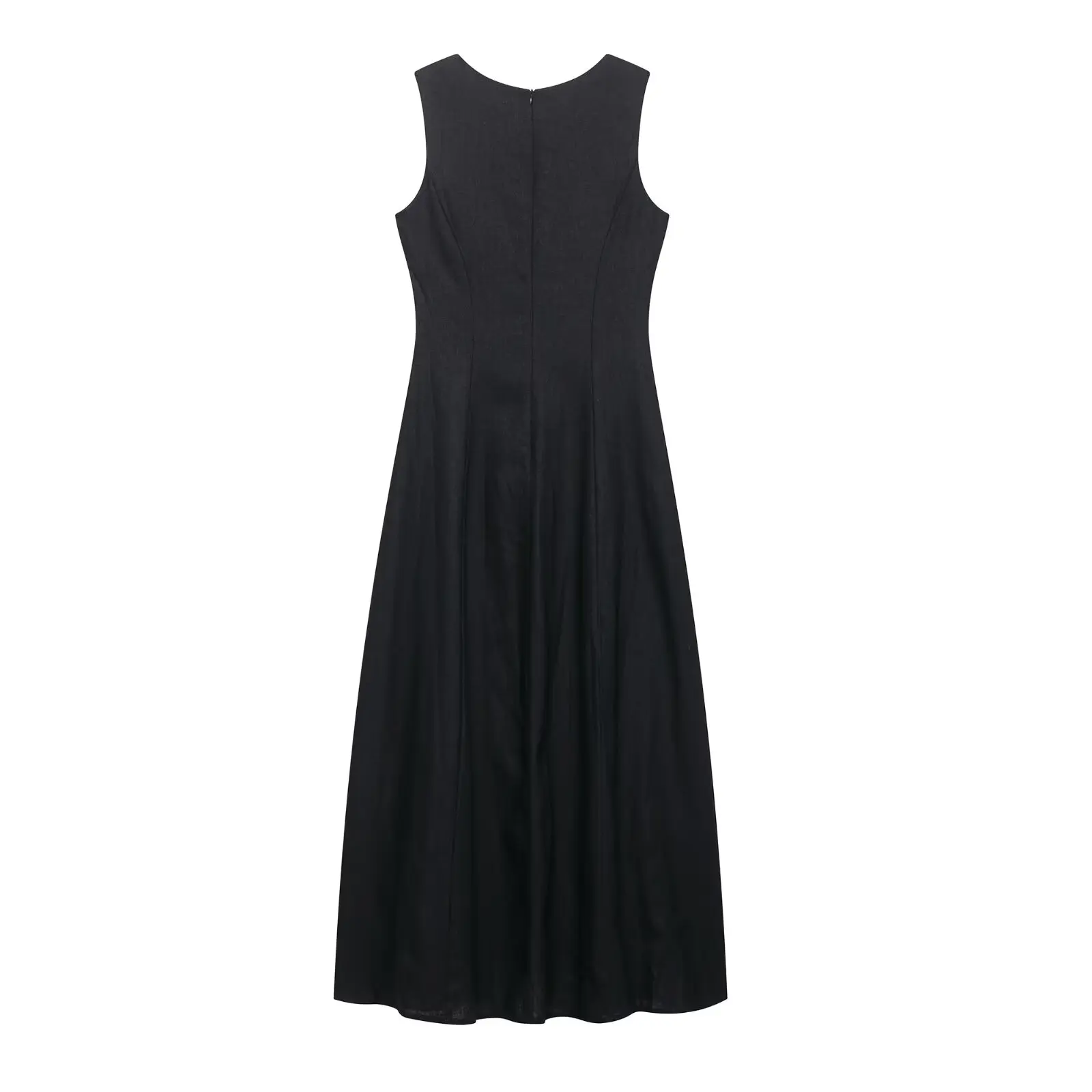فستان نسائي صيفي أنيق من الكتان، بدون أكمام وبياقة مربعة مع سحاب خلفي، مثالي للمناسبات والإطلالات اليومية.