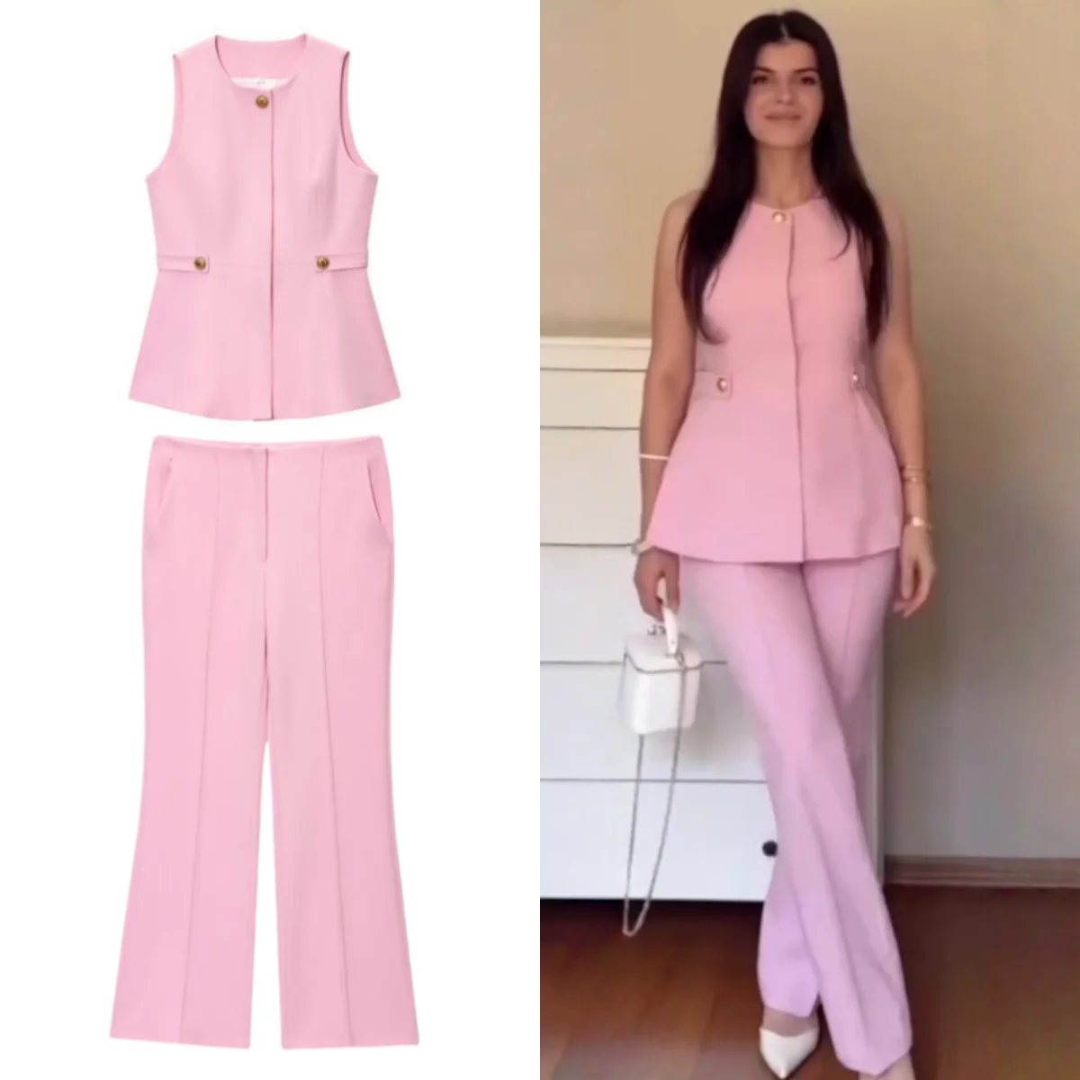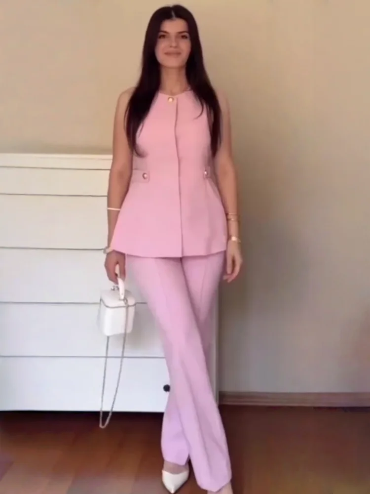 أكملي ستايلك العصري مع بنطلون وردي بخصر متوسط وقصة واسعة وسترة بدون أكمام تضيف لمسة أنثوية راقية.